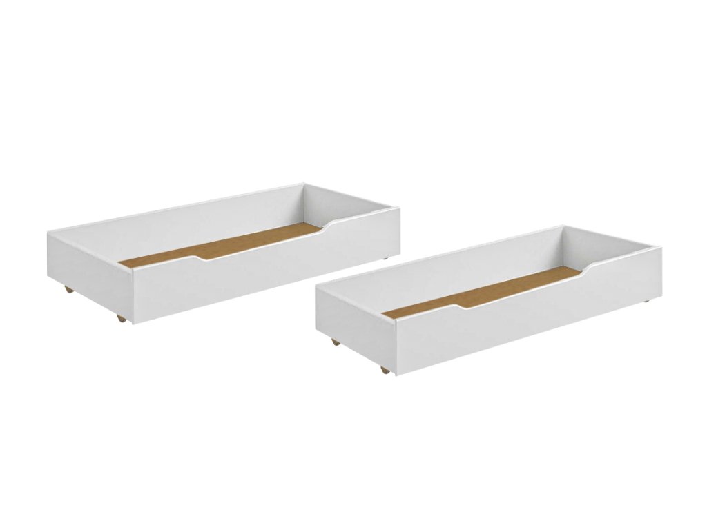 Ágyneműtartó fehér színben a MIX / Diego Pred ágyakhoz. A tároló fiókok gumis kerekeken mozgathatók, így megvédik padlóját a karcolásoktól. Az ágyneműtartó fiók előlapjait tömör borovi fából gyártották, az oldalai bútorlapból készülnek. A fiókok alja HDF.