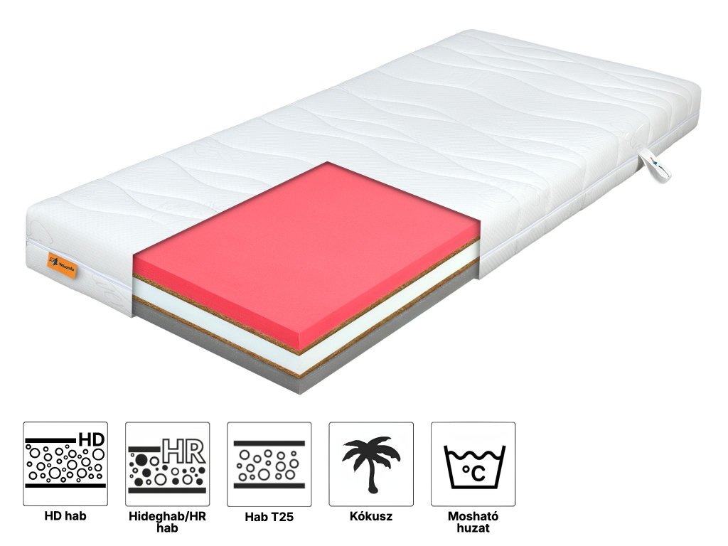 Anyagösszetétel: HD hab, hideg HR hab, T 25 hab, Kókusz, huzat