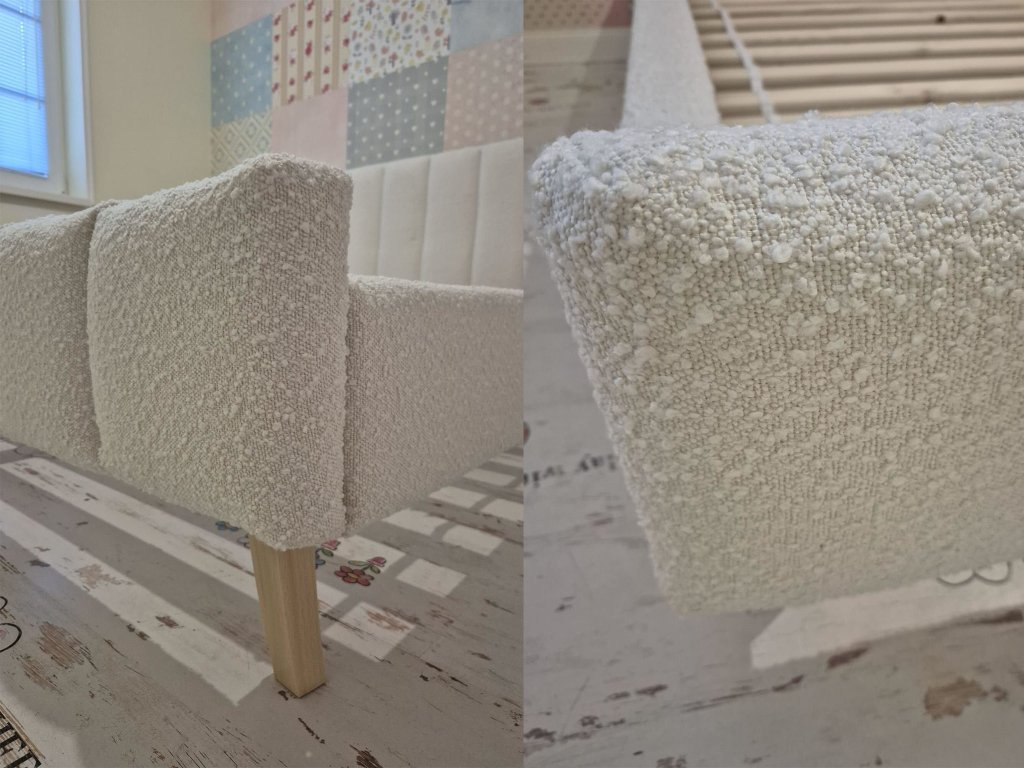 - Anyaga: MDF / Bouclé szövet / fa lábak