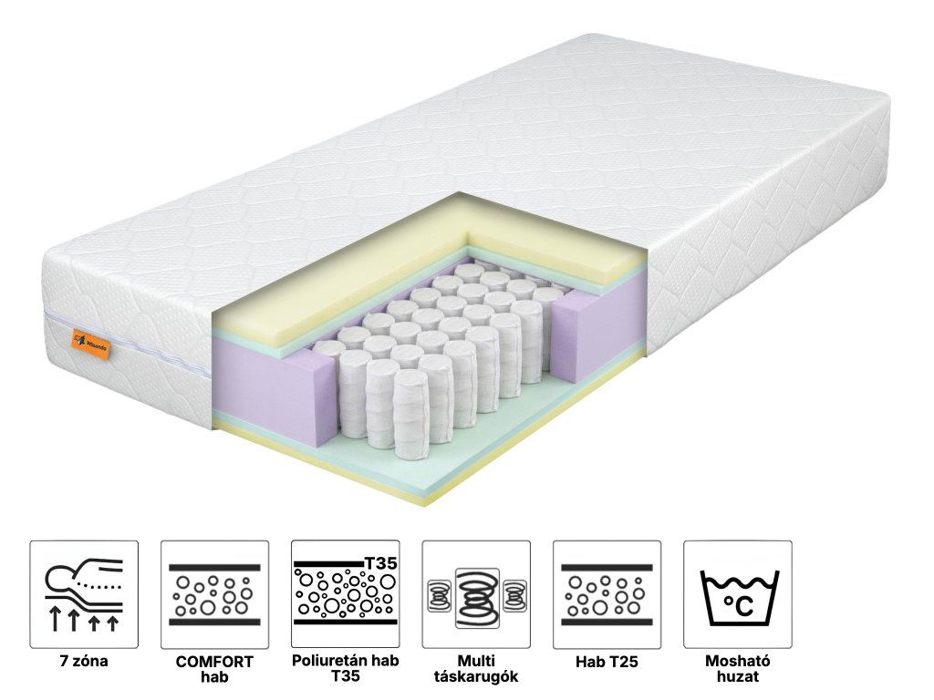 A kiváló minőségű, 7 zónás habból készült, profilozott felületű anyag elősegíti a jobb vérkeringést és az izmok ellazulását pihenés közben. A testhőmérséklet alapján alkalmazkodik a test formájához, ezáltal növelve a kényelmet és az alvás minőségét. Az egyes zónák eltérő keménysége optimális támogatást nyújt a gerincnek, és biztosítja a test természetes pozícióját. Ez a habtípus ideális választás allergiára érzékeny emberek számára is.