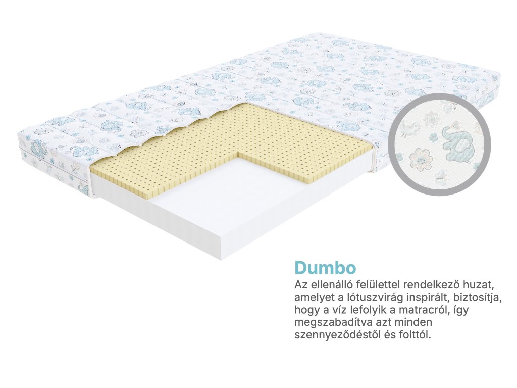 A Dream matrac Dumbo huzata vízlepergető bevonattal rendelkezik, amely megakadályozza a nedvesség, szennyeződések és mikroorganizmusok bejutását a magba. A huzat levehető, 30 °C-on mosható, és biztosítja a levegő megfelelő keringését a száraz, friss fekvőfelület érdekében. Az XSENSOR szenzortechnológiás tesztelés igazolja, hogy a matrac egyenletesen oszlatja el a test nyomását, csökkentve a felfekvések kockázatát, és nyugodt, ergonomikus alvást biztosít. Az OEKO-TEX® I. osztályú és PZH tanúsítványok igazolják, hogy a matrac egészségre ártalmatlan még újszülöttek számára is.