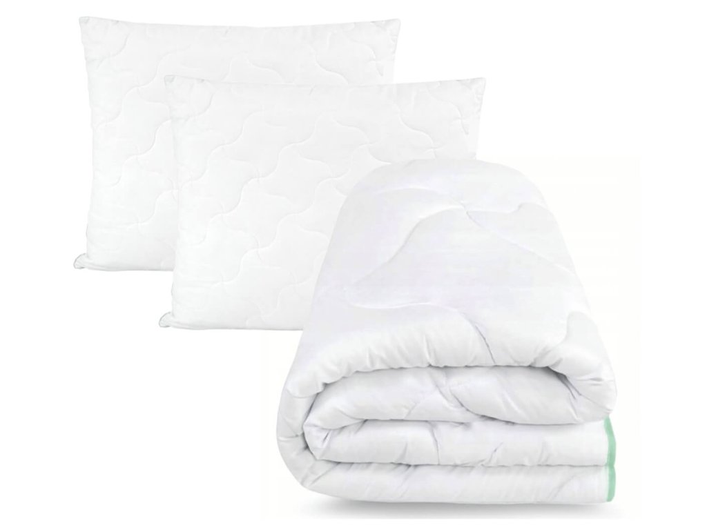 Egész éves KOLRA párna (70x80 cm) és paplan (220x200) szett az ágyba Aloe Vera olajjal, amely garantálja Önnek a tökéletes pihenést az egész éjszaka során.A párna és a paplan is nemzetközileg elismert OEKO-TEX tanúsítvánnyal rendelkezik, amely igazolja, hogy a termék nem tartalmaz ártalmas anyagokat, ezért biztonságos és bőrbarát. Mosógépben maximum 60°C-on mosható. A párna és a paplan is nagyon kellemes tapintású, így nyugtatja majd a bőrét az egész éjszaka folyamán. Puha és kellemes tapintású mikroszálakból készült, és szilikonizált HCS poliészter szállal van töltve, amely a hőszabályozó tulajdonságainak köszönhetően alkalmazkodik a test és a környezet hőmérsékletéhez. Ennek köszönhetően mindkettő rendkívül könnyű, puha, rugalmas és ellenáll a deformációkkal szemben.