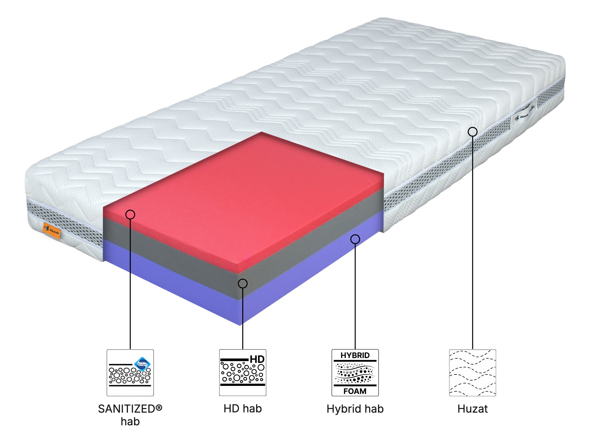 Anyagösszetétel: HD comfort hab, Hibrid hab Y35, Sanitized hab, Huzat