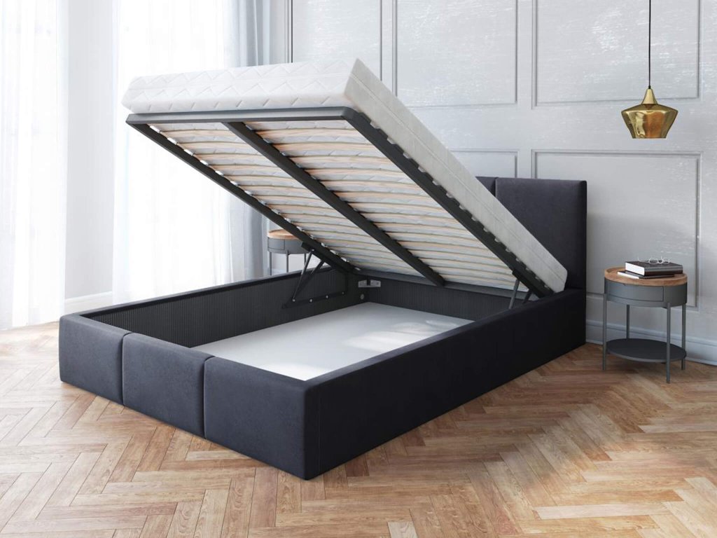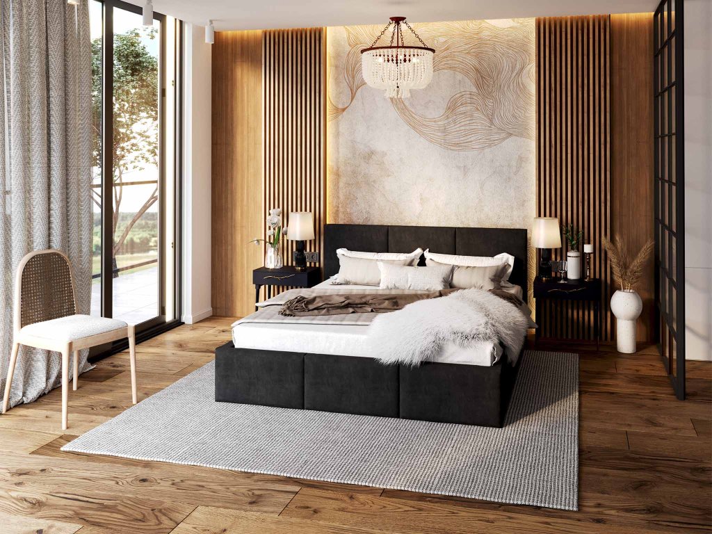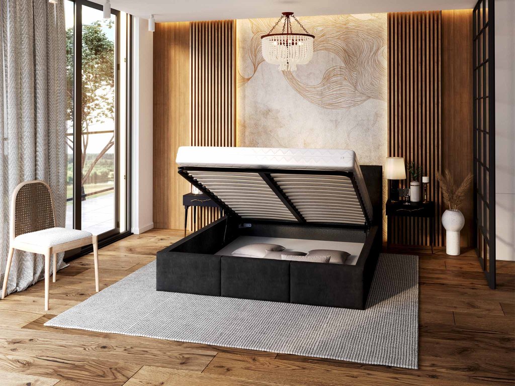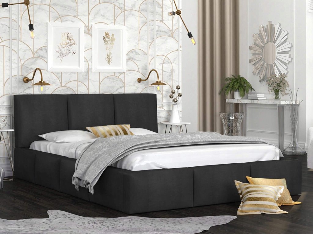 Fekete kárpitozott IZABELLA ágyneműtartós franciaágy