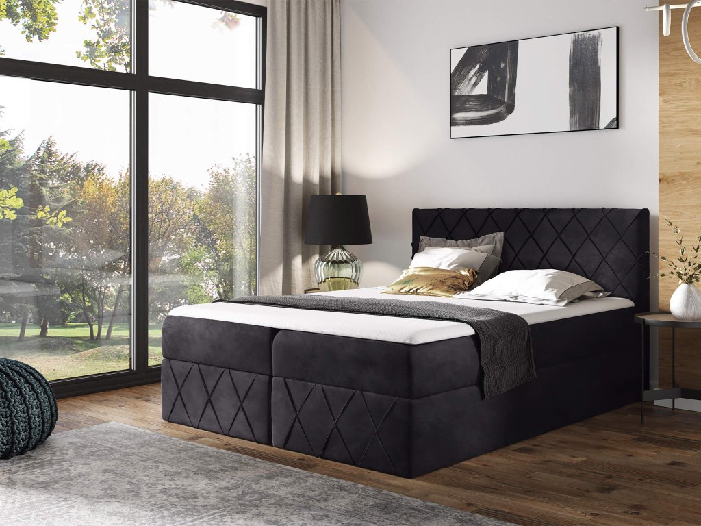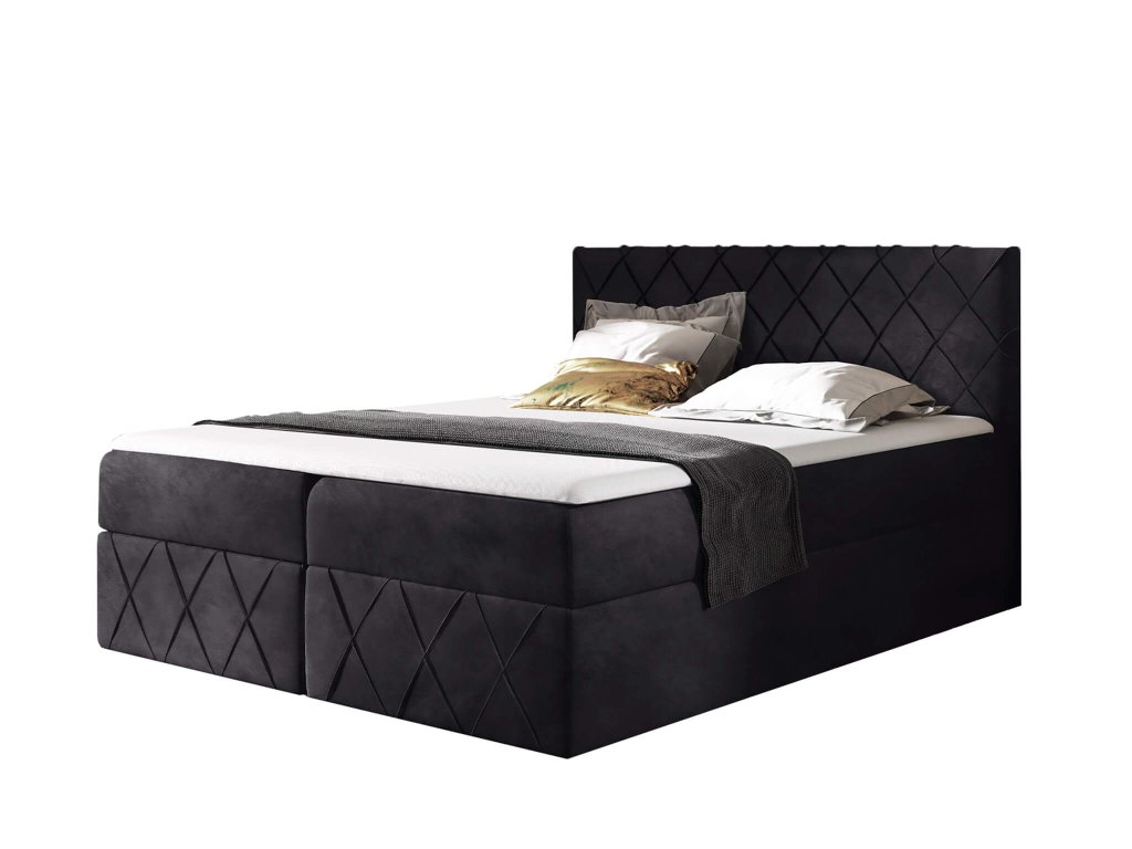 Fekete PAROS Lux ágyneműtartós kárpitozott boxspring ágy