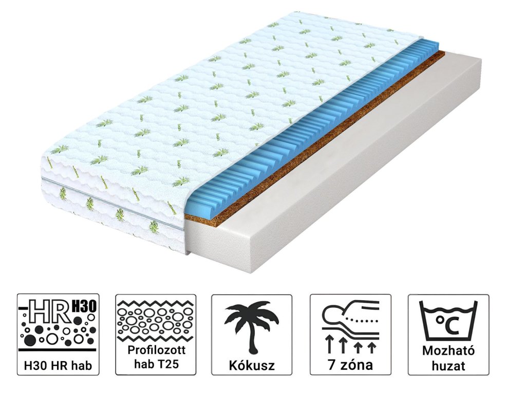 Anyaga: profilozott T25-ös hab, 13 cm vastag HR H30-as hab, 1 cm kókuszréteg, Aloe Vera huzat