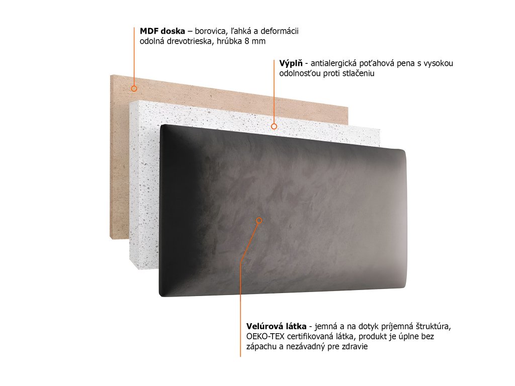 A 3D falpanel 8 mm vastag HDF bútorlapból, habból és kárpitozásból tevődik össze. A bútorkárpit anyagát a Trinity velúr szövet alkotja, amely kellemes tapintású és rendkívül ellenálló a kopással szemben. A DONY fali panel nemcsak dekoratív, hanem funkcionális is. Elnyeli a hangot, csökkenti a zajt és a visszhangot. Mindazonáltal kényelmet biztosít az ágy mögé felragasztva, amit fejtámlaként használhat. A ragasztó nem képezi a csomag részét.