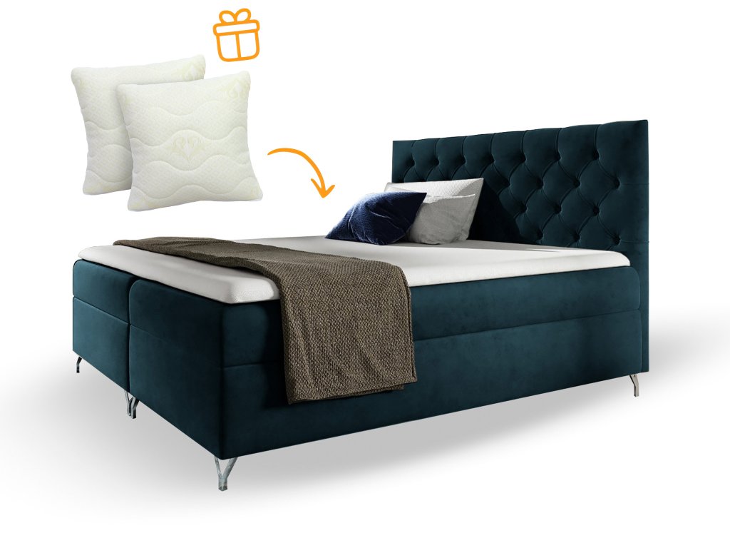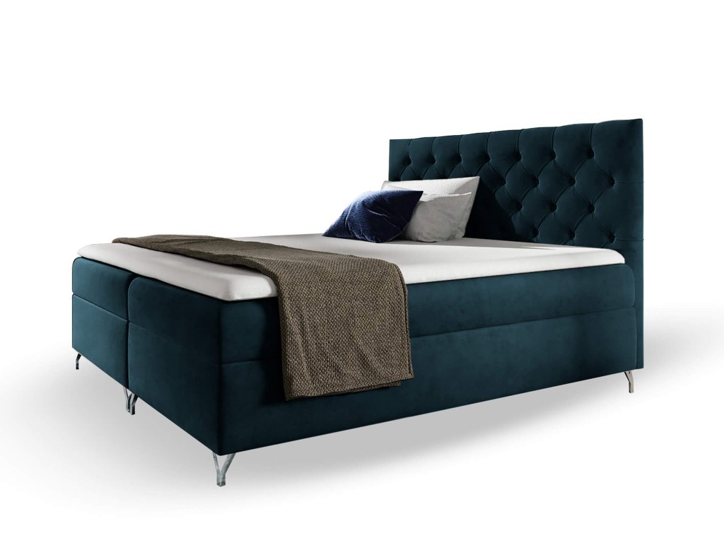A boxspring ágy Magic velvet 2211 szövettel kárpitozott, amely puha, bársonyos és kellemes tapintású. Ez az anyag ellenálló a kikopással szemben és nem bolyhozódik. A sötétkék kontinentális ágy eleganciát visz minden hálószobába.