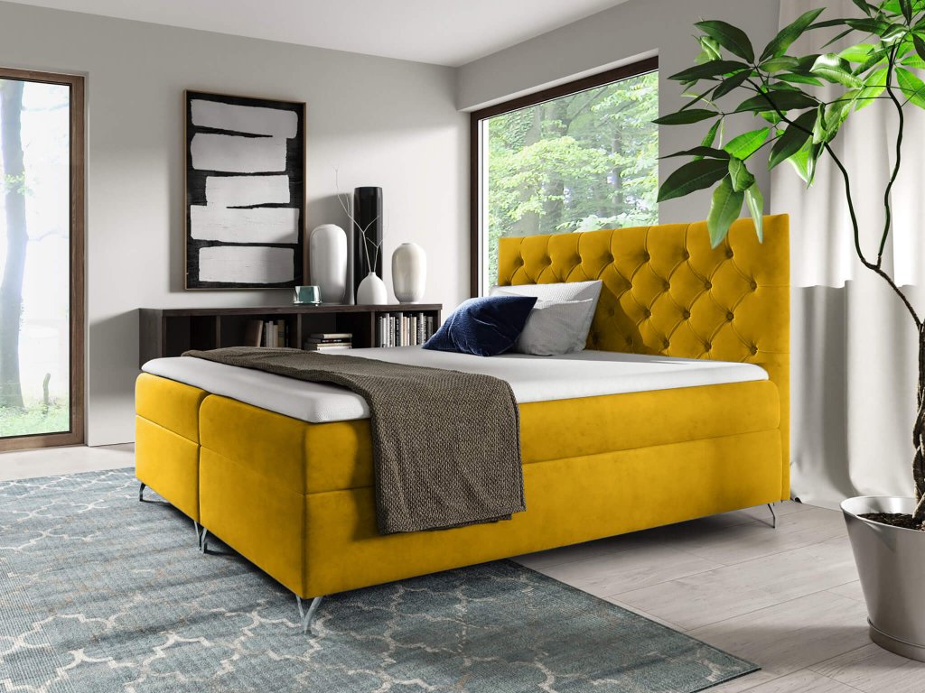 A boxspring ágy Magic velvet 2234 szövettel kárpitozott, amely puha, bársonyos és kellemes tapintású. Ez az anyag ellenálló a kikopással szemben és nem bolyhozódik. A sárga kontinentális ágy eleganciát visz minden hálószobába.