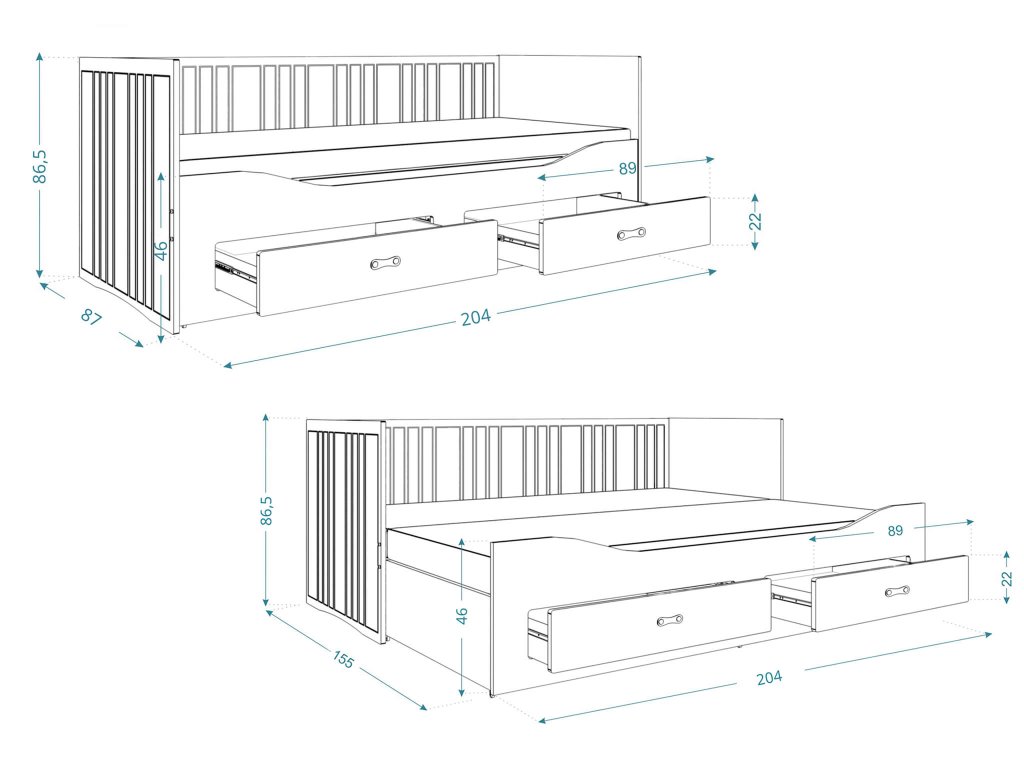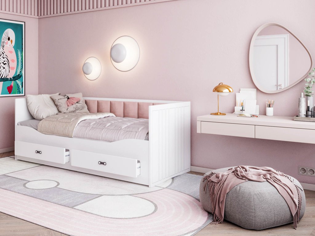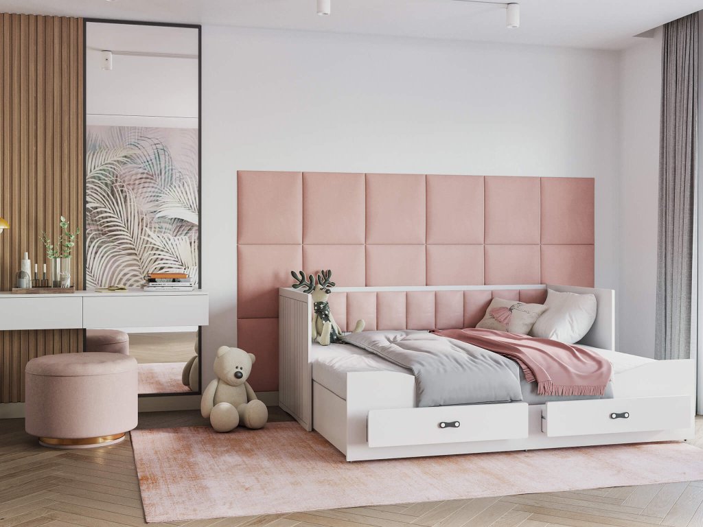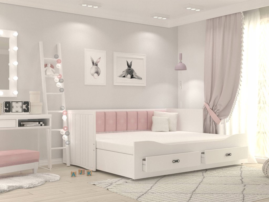 A Hermes széthúzható ágyunk 80 x 200 cm ágyneműtartóval is rendelkezik, így egy igazán praktikus és elegáns bútor darab, amely tökéletes választás lányos gyerekszobákba. A 200 kg teherbírásának és a 200 cm hosszúságának köszönhetően a széthúzható ágy két gyereknek vagy akár két felnőttnek is kényelmes fekhelyet biztosít. A praktikus designjának és a puha kárpitozott paneleknek köszönhetően az ágyat kanapéként is használhatja. Az ágy teljes mérete szétnyitott állapotban 154x200 cm. Minőségi MFD bútorlapból készült ABS élzárással. Kényelmes alvást és stílusos designt biztosít. A praktikussága mellett a strapabíróságával és a stabilitásával is leveszi majd a lábáról. Az ágy fehér színben készül puha kárpitozott rózsaszín panelekkel. Kamasz lányok szobájába is tökéletes. A barátnők érkezésekor elég csak egyszerűen kihúzni és máris kap egy vendégágyat.