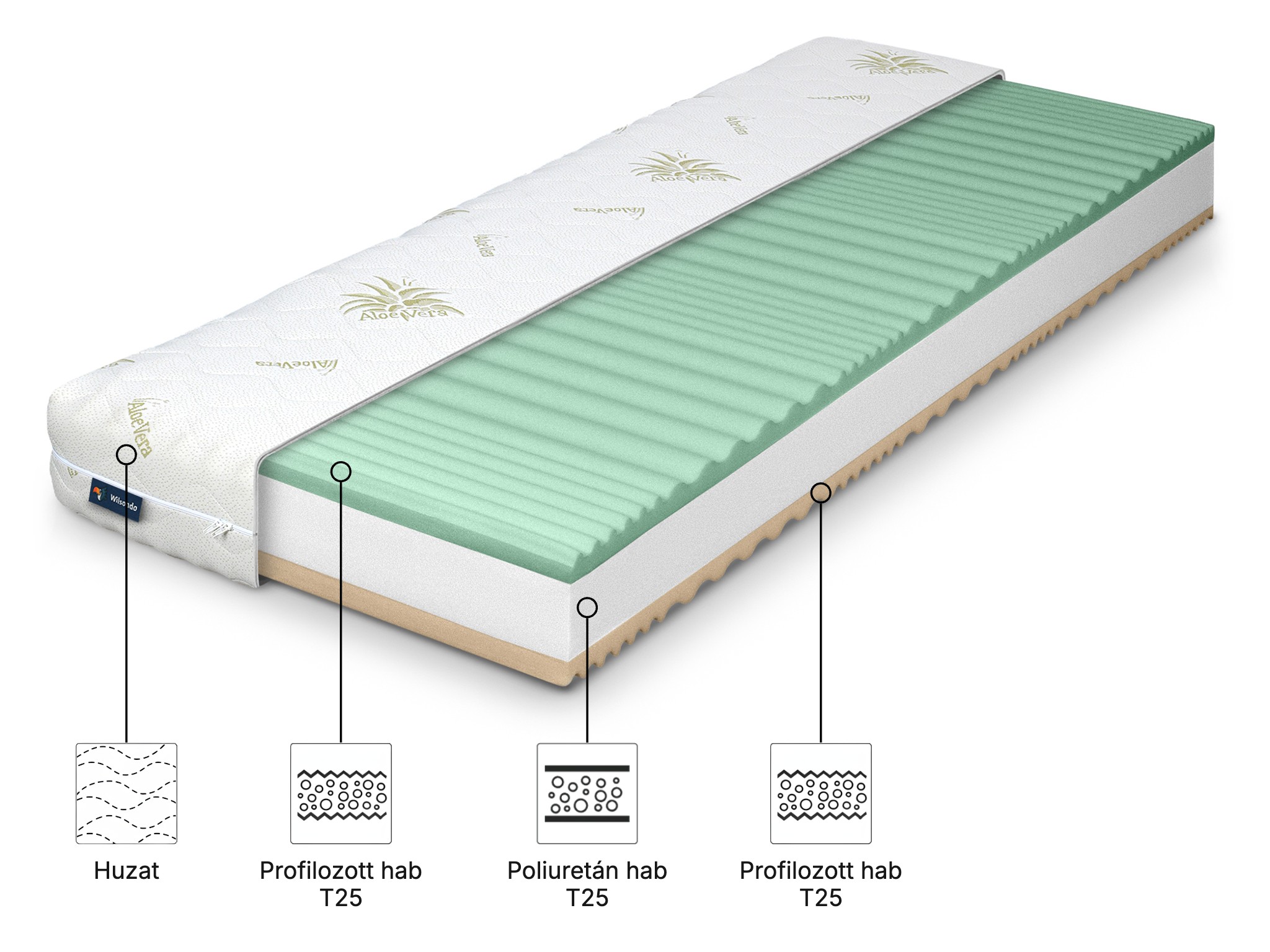 A stabilitást és tartósságot a magas ellenállású T25 poliuretán hab biztosítja. Ez a töltet kiváló alakregenerációs képességgel rendelkezik, így a mindennapos alvás évei után sem keletkeznek bemélyedések az ágyon. Kiegyensúlyozott közepes keménységet kínál, amely ideális támaszték a test számára az egész éjszaka folyamán.