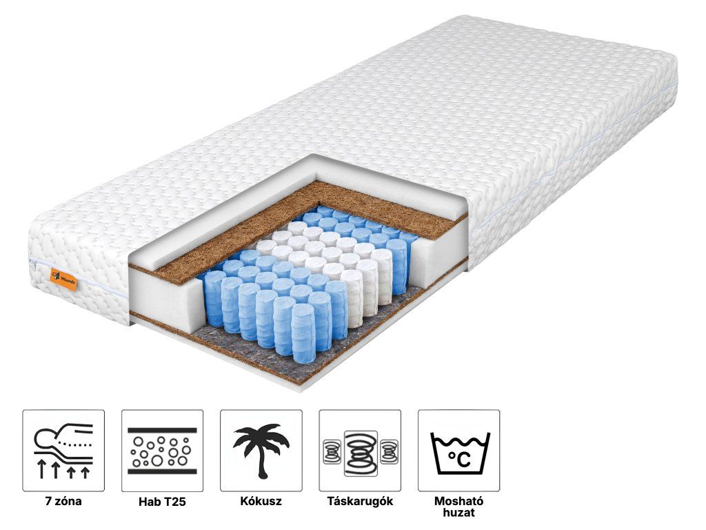 Anyagösszetétel: Táskarugók, Filc alátétek, 2 kókusz réteg, PUR T25 hab