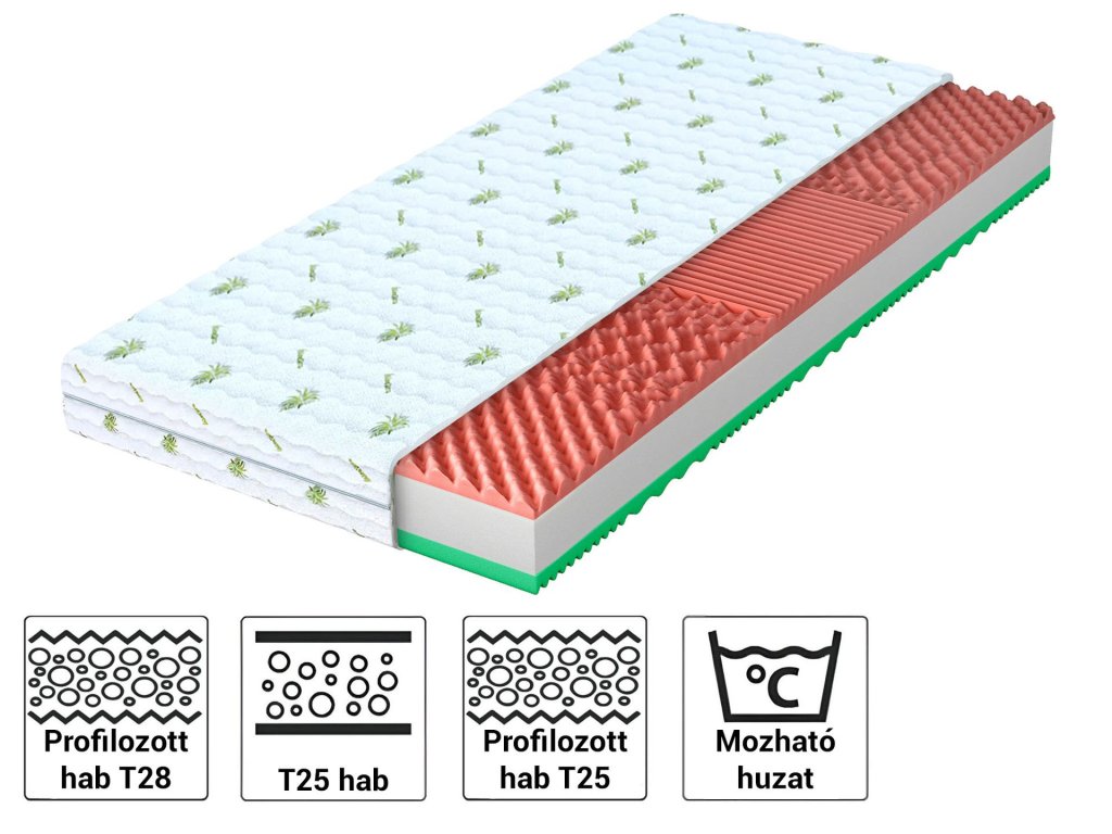 A kiváló minőségű, 7 zónás habból készült, profilozott felületű anyag elősegíti a jobb vérkeringést és az izmok ellazulását pihenés közben. A testhőmérséklet alapján alkalmazkodik a test formájához, ezáltal növelve a kényelmet és az alvás minőségét. Az egyes zónák eltérő keménysége optimális támogatást nyújt a gerincnek, és biztosítja a test természetes pozícióját. Ez a habtípus ideális választás allergiára érzékeny emberek számára is.