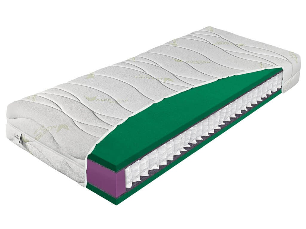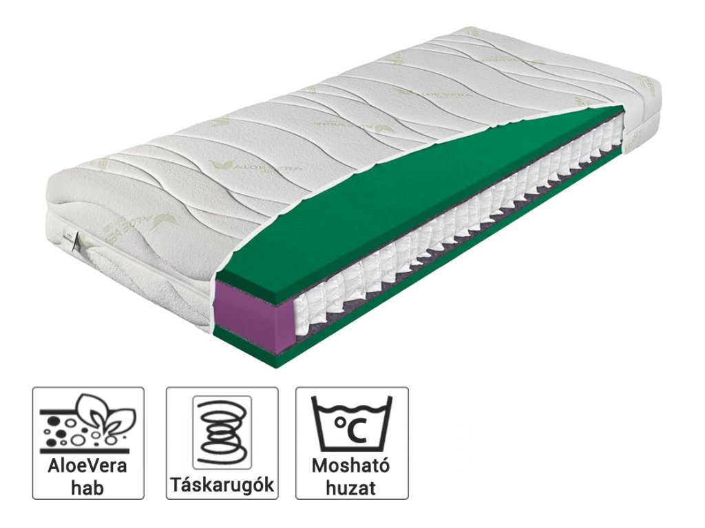 A ZION 200x200 cm AloeVera hab matrac táskarugós alappal nagyon rugalmas és jól idomul az ember testéhez. A táskarugós matracok rendkívüli kényelelmesek és maximális pihenést garantálnak. A matrac forgatásával hosszútávon élvezheti ezt a kényelmet. Minden rugó egy kis "táskába" van csomagolva, amely lehetővé teszi, hogy mindegyik külön hozzáidomuljon a test formájához. A rugók körül hab szélek helyezkednek el, amelyek csökkentik a rugók számát. A rugóknak köszönhetően a matracban tökéletes a levegő áramlása. A felső és az alsó réteg Aloe Vera kivonatot tartalmazó mikrokapszulákból álló habból készült. Ez az anyag biztosítja a minőségi alvást és természetes méregtelenító tulajdonságokkal is rendelkezik. Ráadásul olyan környezetet teremt, amely nem alkalmas a baktériumok és atkák elszaporodására. A matracrétegeket a különleges svájci környezetbarát ragasztóval, a vizes alapú SIMALFA-val ragasztják össze. A matracnál 3 féle matrachuzat közül lehet választani, amelyek cipzárosak és mosógépben moshatók. Mosási hőfok: 60 °C.
