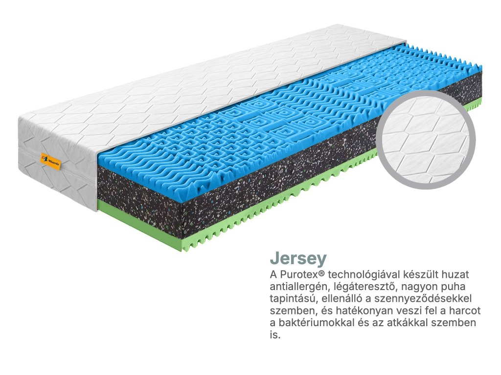 Anyagösszetétel: Profilozott poliuretán hab T25, Újrahasznosított RE hab, Jersey huzat