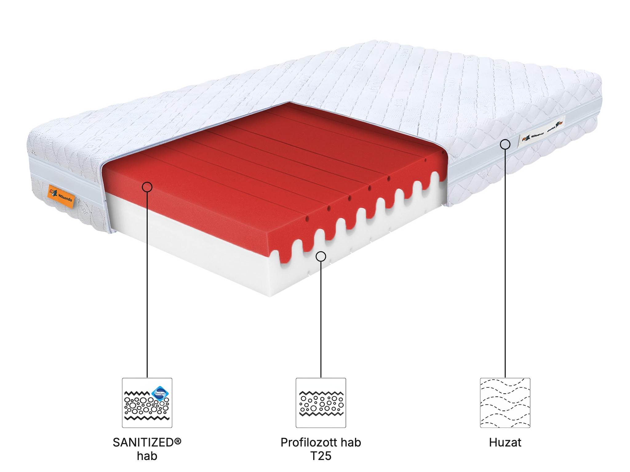 Az egészséges és higiénikus alvási környezetet a Sanitized® antibakteriális hab és az aktív ezüsttel ellátott Silver huzat biztosítja. Ezek az anyagok aktívan védenek a baktériumok, penészgombák és poratkák szaporodása ellen, hozzájárulva a friss és tiszta alváshoz. A praktikus levehető huzat 30 °C-on mosható, ami megkönnyíti a karbantartást és hosszú távú higiéniát garantál. A matrac kezelését praktikus fogantyúk könnyítik meg. A matrac élettartamának meghosszabbítása és védelme érdekében javasoljuk matracvédő használatát, amely megóvja a szennyeződésektől és a kopástól.