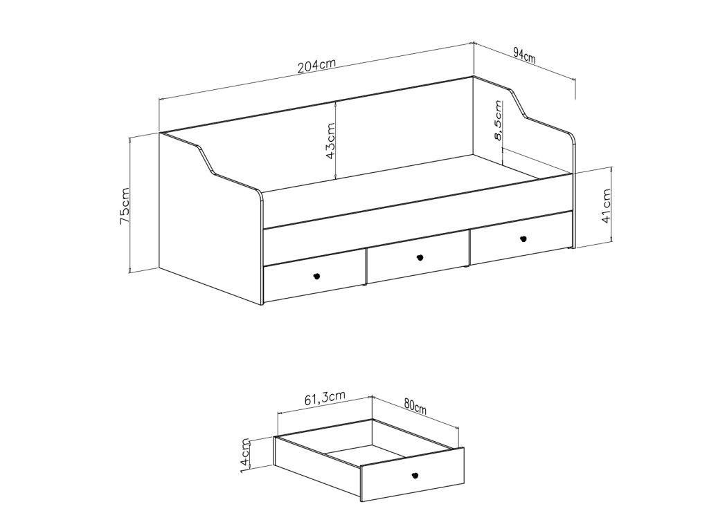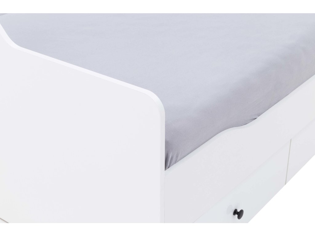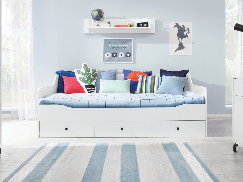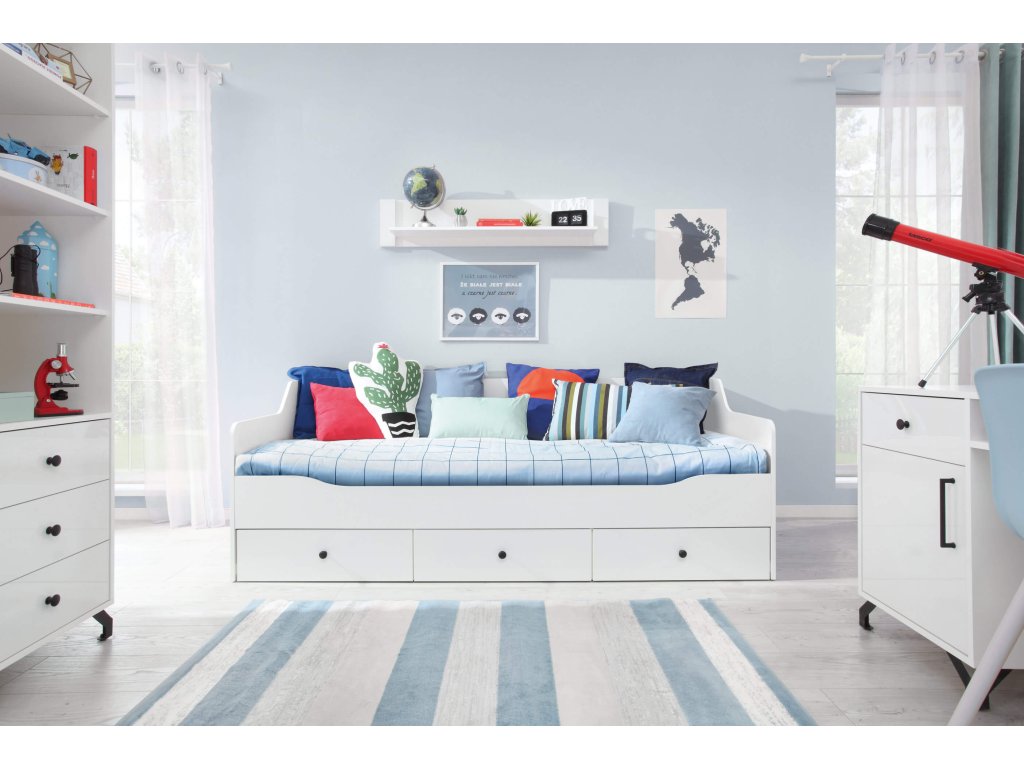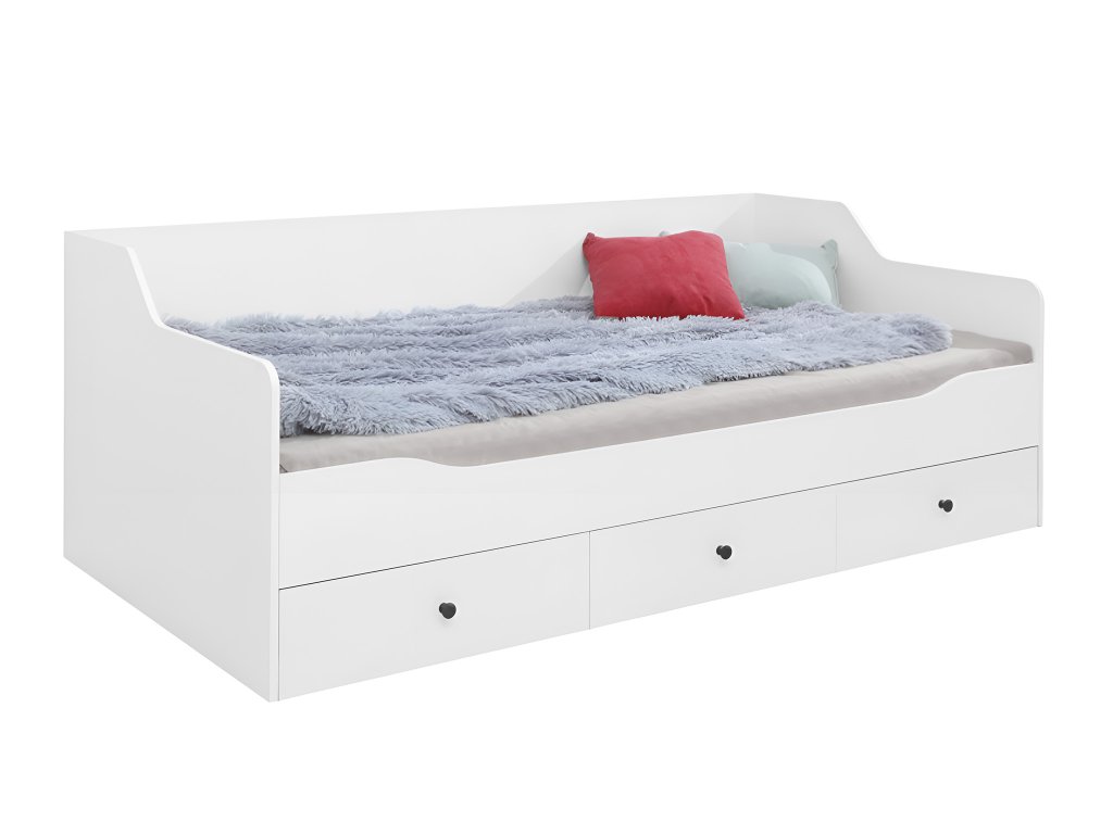 A fehér MILÁNÓ 200x90 cm gyerekágy megvédi gyermekét a hidegtől és a huzattól a praktikus támláknak köszönhetően. Az ágy három ágyneműtartó fiókkal rendelkezik. Minimalista stílusának köszönhetően lányos és fiús gyerekszobákba is tökéletes választás. Az ágy három praktikus tároló fiókkal rendelkezik, ahová elhelyezheti az ágyneműt vagy a játékokat. A bútor darabok minőségi laminált bútorlapokból készülnek fém fogantyúkkal. A háttámlának köszönhetően nappal kanapéként is használható. Az ágy részét képezi a 16 mm vastag ágyrács laminált szilárd bútorlapból, kivágott szellőző nyílásokkal.