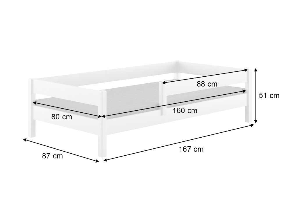 Elegáns és modern fehér színű MIX gyerekágy több méretben kapható és minden gyerekszobába tökéletes választás, legyen szó egy modern vagy klasszikus szobáról. A MIX ágy gyerekeknek leszerelhető leesésgátlóval és 150 kg teherbírású léces ágyráccsal együtt kapható. Az ágy több méretben kapható: 140x70 cm, 160x80 cm, 180x80 cm, 180x90 cm és 200x90 cm.Az ágy tömör fából és DTD deszkából készült.Az ágy szélei minőségi 1 milliméteres ABS széllel vannak biztosítva. Az ágyat egészségre nem káros, vizes alapú ökológiai festékkel kezelték, amely nem ártalmas a gyermekekre.