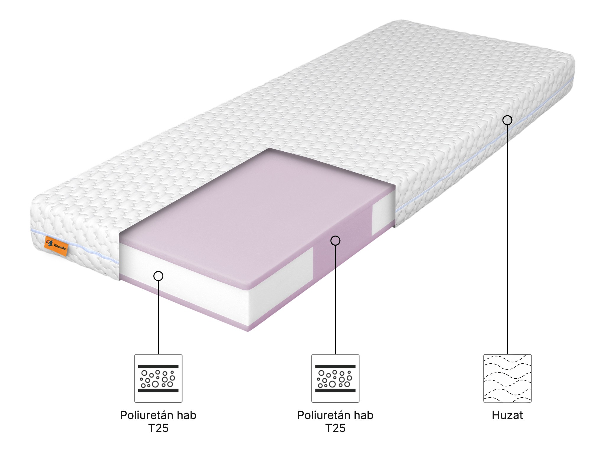 Kiváló minőségű hab, amely alap- vagy kiegészítő rétegként szolgálhat a matracokban, és kiemelkedően ellenáll a kopásnak és a deformációknak. Ezek a tulajdonságok segítenek megőrizni a matrac formáját, meghosszabbítják az élettartamát, és fokozzák az alvás kényelmét.