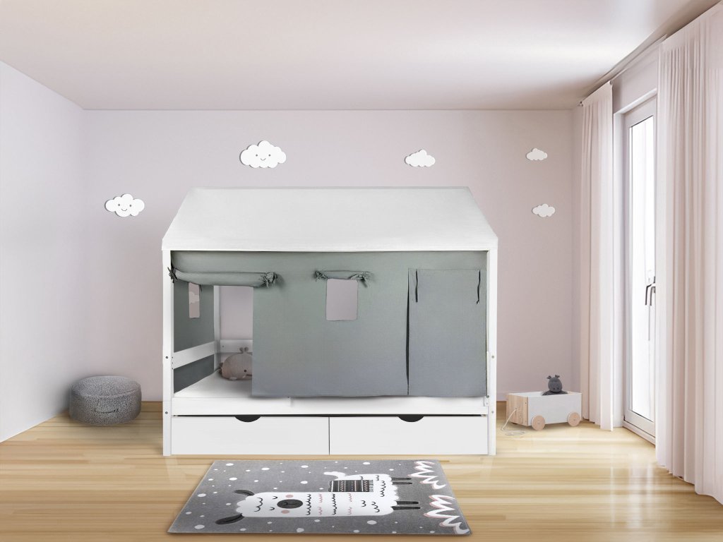 Kínálatunkban megtalálja az ágyhoz hozzávásárolható kiegészítőket is: fehér tetőt és szürke függönyt.