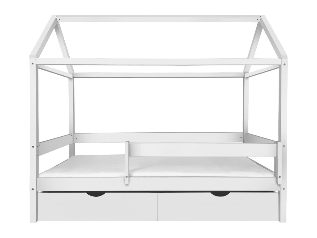 A fehér PERY házikó ágyneműtartós gyerekágy 200x90 cm tömör fából készült. A fehér színének köszönhetően kellemes atmoszférát teremt majd a gyerekszobában, így is hozzájárulva gyermeke pihentető alvásához. Az ágy részét képezi két ágyneműtartó tároló fiók is, amely tökéletes az ágynemű, a plédek vagy a párnák tárolására. A gyerekágyhoz minőségi léces ágyrács is tartozik, amely biztosítja a megfelelő alátámasztást és a kényelmet alvás során. A levehető leesésgátlónak köszönhetően az igényeihez igazíthatja és biztonságossá teheti gyermekének. A leesésgátló könnyen felszerelhető és leszerelhető az ágy jobb vagy bal oldalára is. Ezen kívül a házikó ágyat kreatívan fel is lehet díszíteni fényfüzérekkel vagy egyéb dísztárgyakkal. Pár pléd segítségével pedig egy igazi kis bunkert is létrehozhatnak. Mindennek csak a gyerekek kreativitása szabhat határt. A Pery házikó formájú ágy tehát nem csak egy praktikus ágy, de biztosítja majd gyermeke kényelmét, pihenését és szórakozását is.