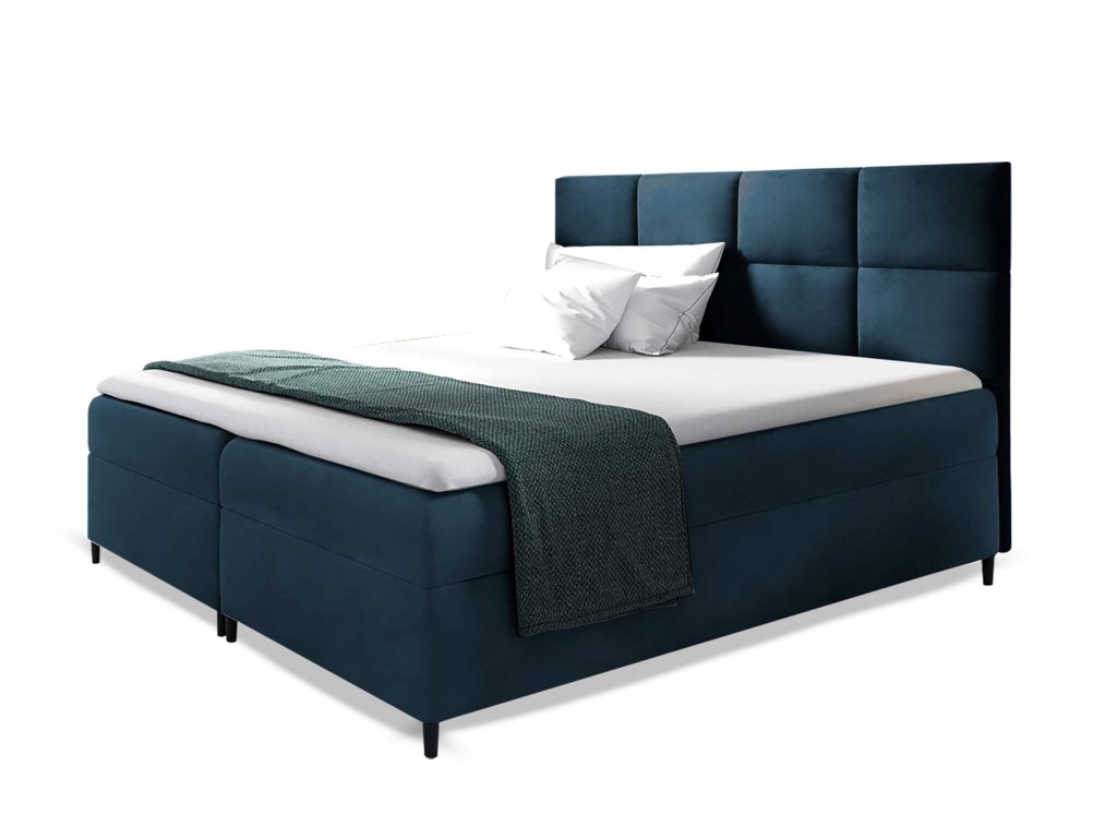 Stílusos sötétkék bársonyos szövettel kárpitozott LEILA kontinentális franciaágy, amely ideális választás minden elegánsan berendezett hálószobába. A boxspring ágy ágyneműtartóval, ágyráccsal, fedőmatraccal és matracokkal együtt kapható. Az ágyhoz designos fekete fa lábak is tartoznak, amelyek még luxusosabbá és modernebbé varázsolják. Az ágy beépített matracokkal és ágyráccsal is rendelkezik. A matracok minőségi Bonell rugókból és magas rugalmasságú T30-as habból állnak. A Bonell rugók a leginkább használt rugók a matracok gyártására, amelyek biztosítják a matracban a szellőzést is. Specifikus formájuk és erejük van, amely megfelelő alátámasztást biztosít terhelés esetén. A magas rugalmasságú T30-as hab megfelelő puhasággal, rugalmassággal és hosszú élettartammal rendelkezik. A Leila kontinentális ágy ágyneműtartóval is rendelkezik. A két ágyneműtartó tároló rugós rendszerrel nyitható. A fedőmatrac (Topper) magas rugalmasságú habból készült, amely reagál a test hőjére és minden mozdulatára. Rugalmasságot és puhaságot biztosít, melynek köszönhetően kényelmesen tud pihenni az egész éjszaka során. A Topper 5 centiméter vastag habból áll és ajánlatos 2-3 havonta megfordítani. A levehető huzat cipzáras és mosógépben mosható 30 °C-on. A kidolgozott gyönyörű magas steppelt háttámlának praktikus előnyei is vannak, tökéletes szolgálatot tesz könyvolvasáskor vagy tévénézés közben. A boxspring ágy magas, melynek köszönhetően könnyű róla lekelni.