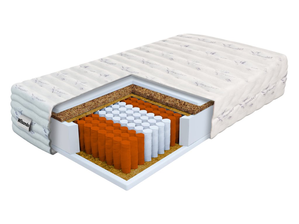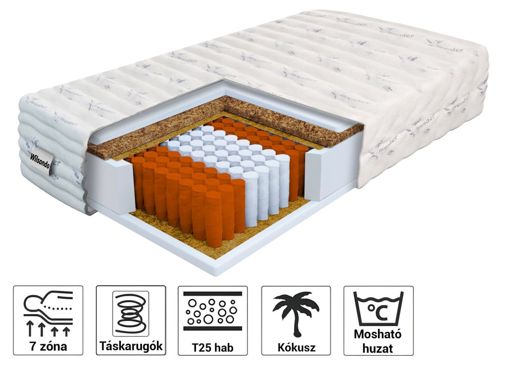Anyagösszetétel: Filc, NanoHARD táskarugók, Poliuretán PUR hab 25 kg/m3 sűrűséggel, Lavender huzat, Kókuszréteg