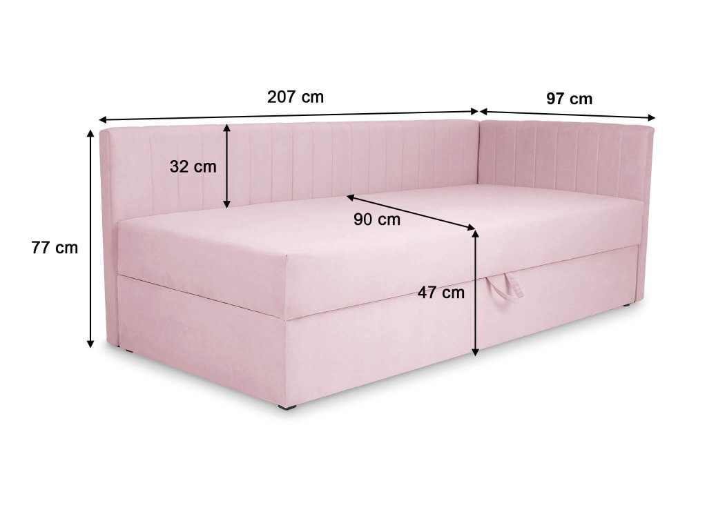 A tökéletes ágyat keresi a kislánya gyerekszobájába? A Teodor rózsaszín ágyneműtartós ágy 90x200 nagyon jó választást jelent minden lányos gyerekszobába. A különleges designjának és tulajdonságainak köszönhetően bárki számára jó választás jelent. Egy hosszú és egy rövid ágytámlával is rendelkezik, amely megvédi gyermekét a hideg faltól, továbbá a fal is biztonságban lesz mindenféle szennyeződésektől. A heverő nagy előnye a tágas ágyneműtartó, amelybe elhelyezheti az ágyneműt, párnákat, szezonális ruhákat. Az ágyneműtartó egy fogantyú segítségével nyitható. Az ágy részét képezi egy kényelmes matrac is. A kompakt méreteinek köszönhetően a kisebb szobákba is jó választást jelent. A rózsaszín színe főleg a lányos gyerekszobákba vagy esetleg a vendégszobába teszik megfelelő választássá. Minőségi anyagokból készült. Az ágy szerkezete és a háttámla tömör fából készült, az ágy pedig forgácslaptból bonell rugókkal és T-30-as habbal. Különleges Trinity szövettel kárpitozott, amelynek köszönhetően biztosítva lesz a hosszú élettartama. A heverő háta nem ugyanolyan szövettel kárpitozott mint a heverő többi része.