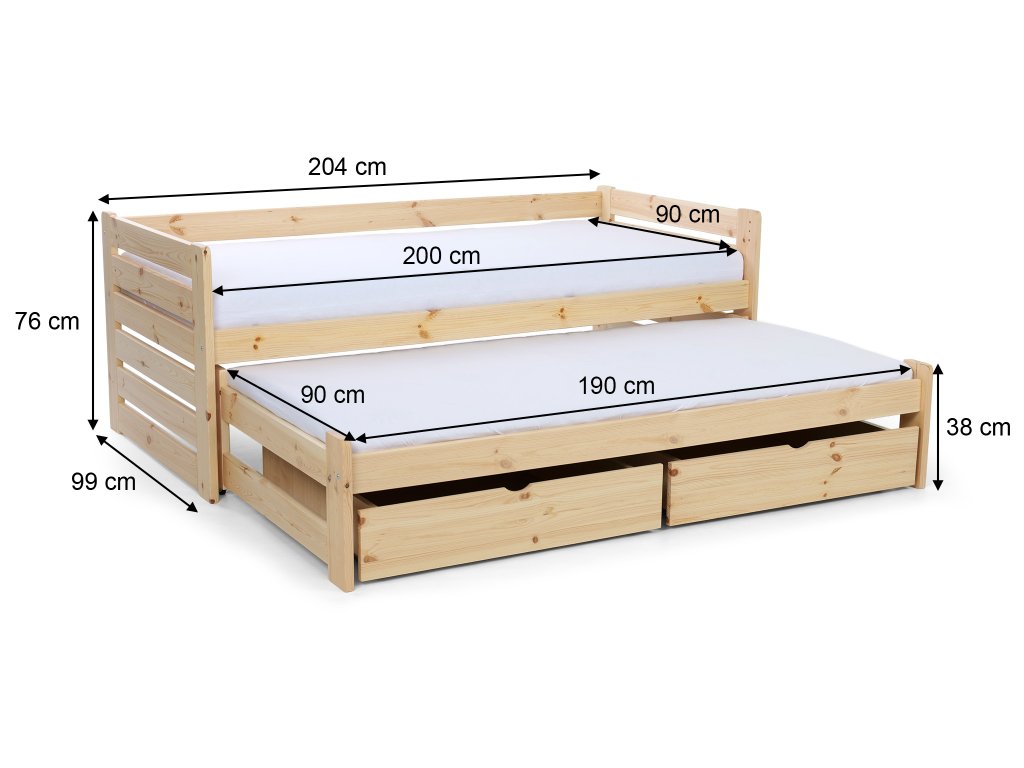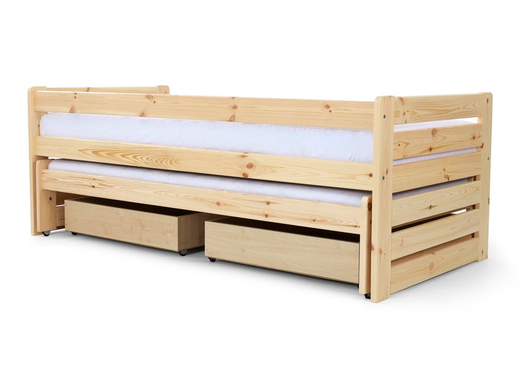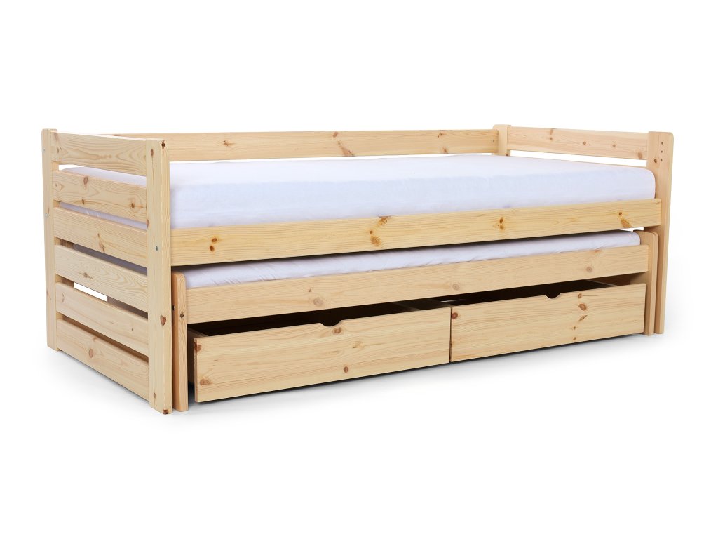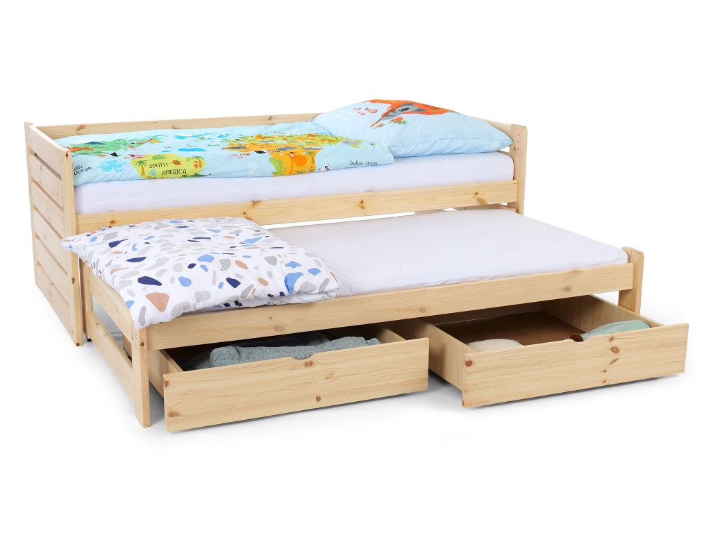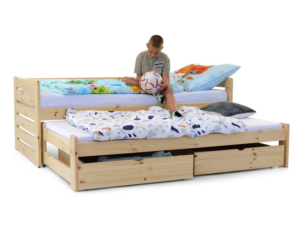 A tömör fából készült VERONIKA 11 gyerekágy 90 x 200 cm tökéletes választás kisebb gyerekszobákba is. Az ágy kihúzható vendégággyal, ágyráccsal és ágyneműtartó fiókkal rendelkezik. Tömör borovi fenyőből készült, melynek köszönhetően nagyon stabil a szerkezete. A faágy natúr borovi színben kapható, 3x lakkozva természetre nem ártalmas ökológiai lakkal. Az ágy két tároló fiókkal is rendelkezik, amelyek műanyag kerekeken mozognak, hogy ne sértsék meg a padlót. Nincsenek az ágyhoz rögzítve, így könnyen mozgathatók.