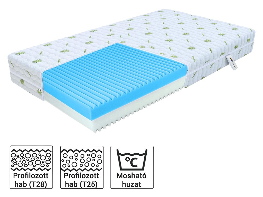 Matrac összetétele: T25-ös poliuretán PUR hab, T28-as poliuretán PUR hab, huzat