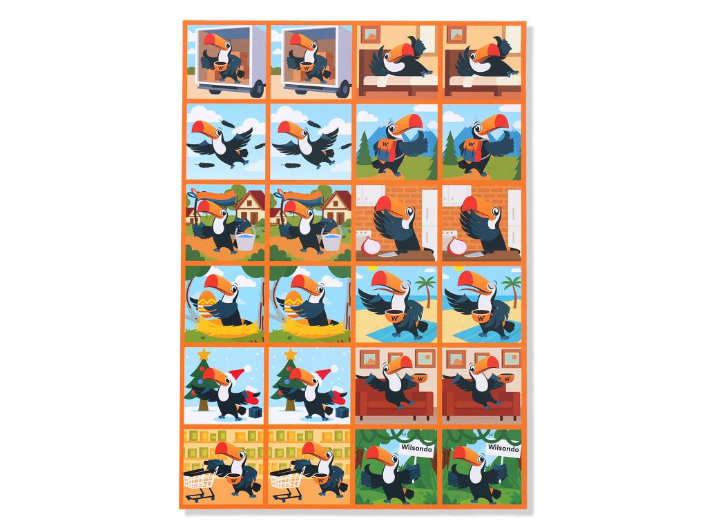 Minden kártya vidám történetet rejt — Wilsondo vásárol, hagymát vág, fát épít, teherautót rakodik ki, és további meglepő helyzetekbe kerül. Minden kártya megfordítása új meglepetést és mosolyt hoz, amely azonnal leköti a gyerekeket. A memóriajáték Wilsondo tukánnal ideális választás a minőségi családi időtöltéshez. Kicsik és nagyok együtt élvezhetik a játékot, szórakozhatnak, és közben észrevétlenül gyakorolhatják a memóriát és a figyelmet.