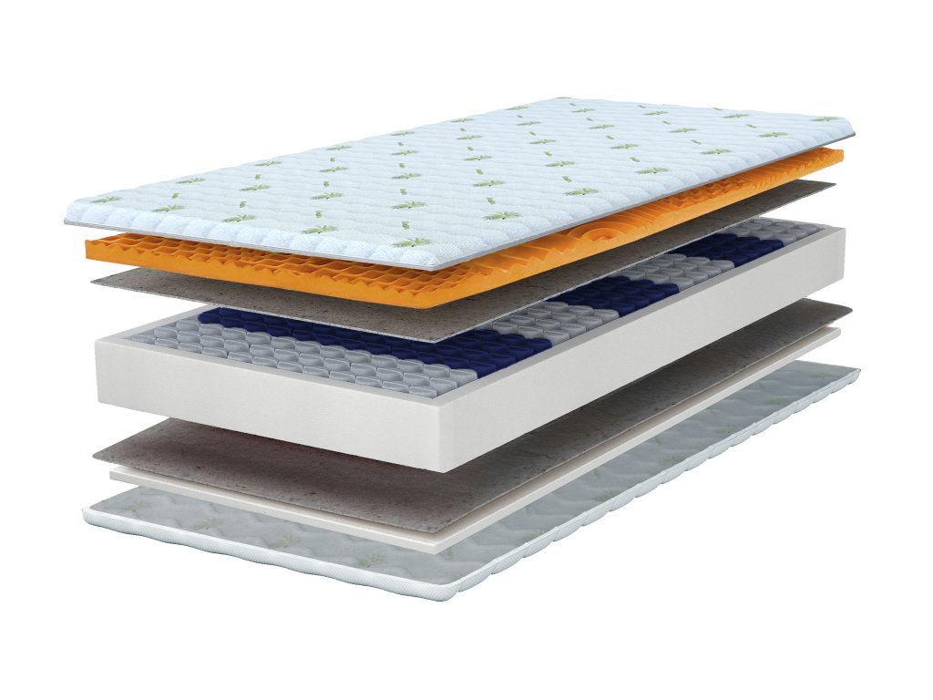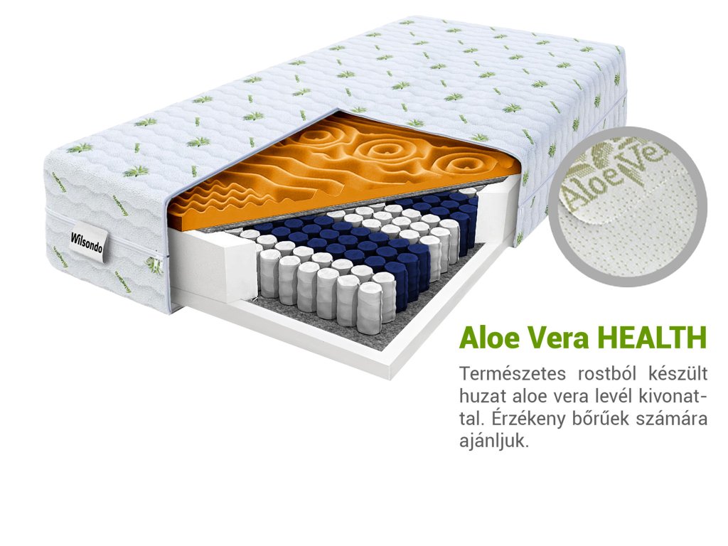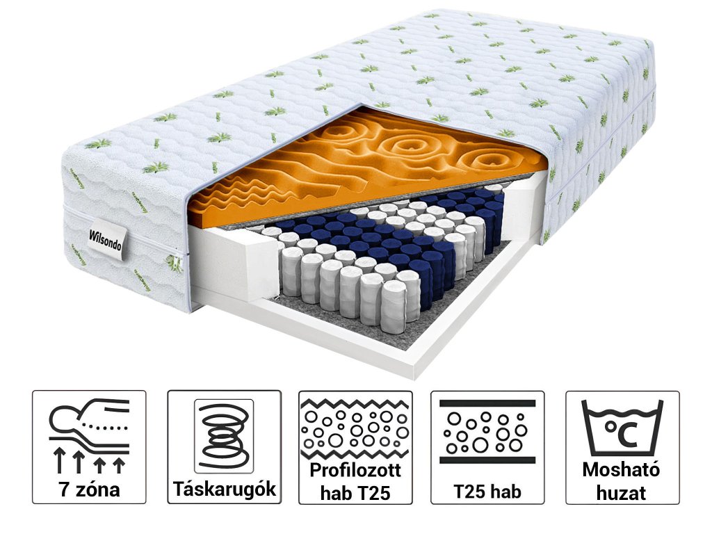 Anyagösszetétel: Filc, Tasakos rugók(több mint 289 rugó/m2), T25 poliuretán hab 25 kg/m3 sűrűséggel, Aloe Vera huzat