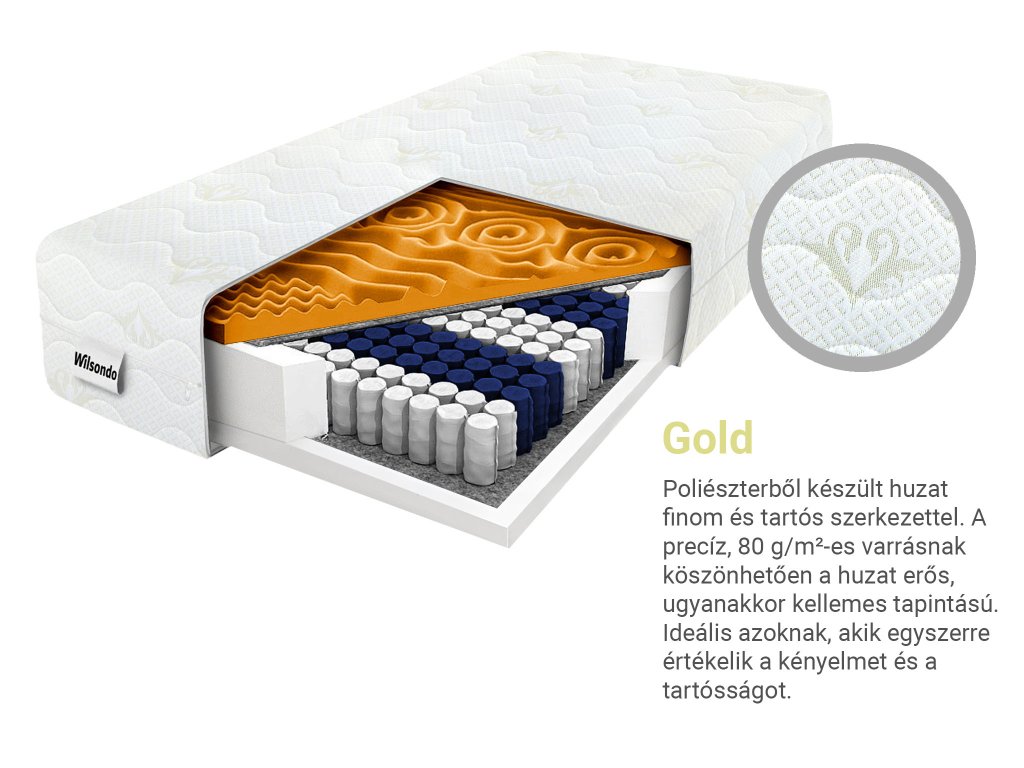 Anyagösszetétel: Filc, Tasakrugók(több mint 289 rugó/m2), T25 poliuretán hab 25 kg/m3 sűrűséggel, Gold huzat