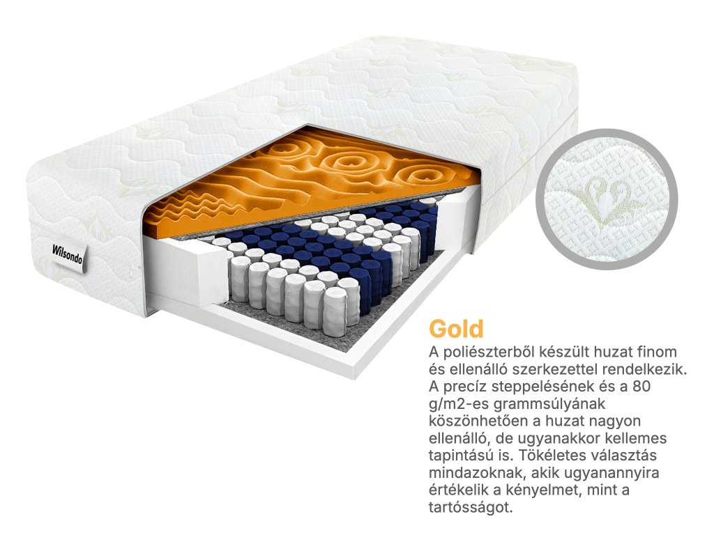 Anyagösszetétel: Filc, Tasakrugók(több mint 289 rugó/m2), Poliuretán hab T25 25 kg/m3 sűrűséggel, Gold huzat