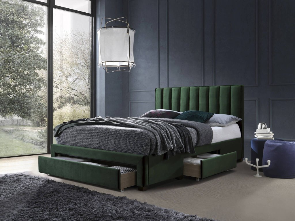 Egy káprázatos, luxusos és pazar franciaágyat keres a hálószobába? A sötétzöld szövettel kárpitozott GRACE franciaágy 160 x 200 cm tökéletes választás minden otthonba. A gyönyörű ágyunknak köszönhetően igazán kényelmesen pihenhet az egész éjszaka folyamán. A franciaágy lamellás ágyráccsal együtt kapható, amelyhez habmatrac vásárlását ajánljuk. Az ágy magas díszes háttámlával rendelkezik, amely vertikális steppeléssel rendelkezik. A kárpitozott ágy tömör kaucsukból készül és szürke velúr szövettel kárpitozott. Ez az anyag nagyon puha, kellemes tapintású és lágy. Az ágy remek kiegészítője a három praktikus ágyneműtartó fiók. A fiókok kerekek segítéségével mozgathatók. Az ágy végében egy nagyobb, két oldalon pedig egy-egy kisebb fiók található. Az univerzális design remekül beillik minden otthonba.